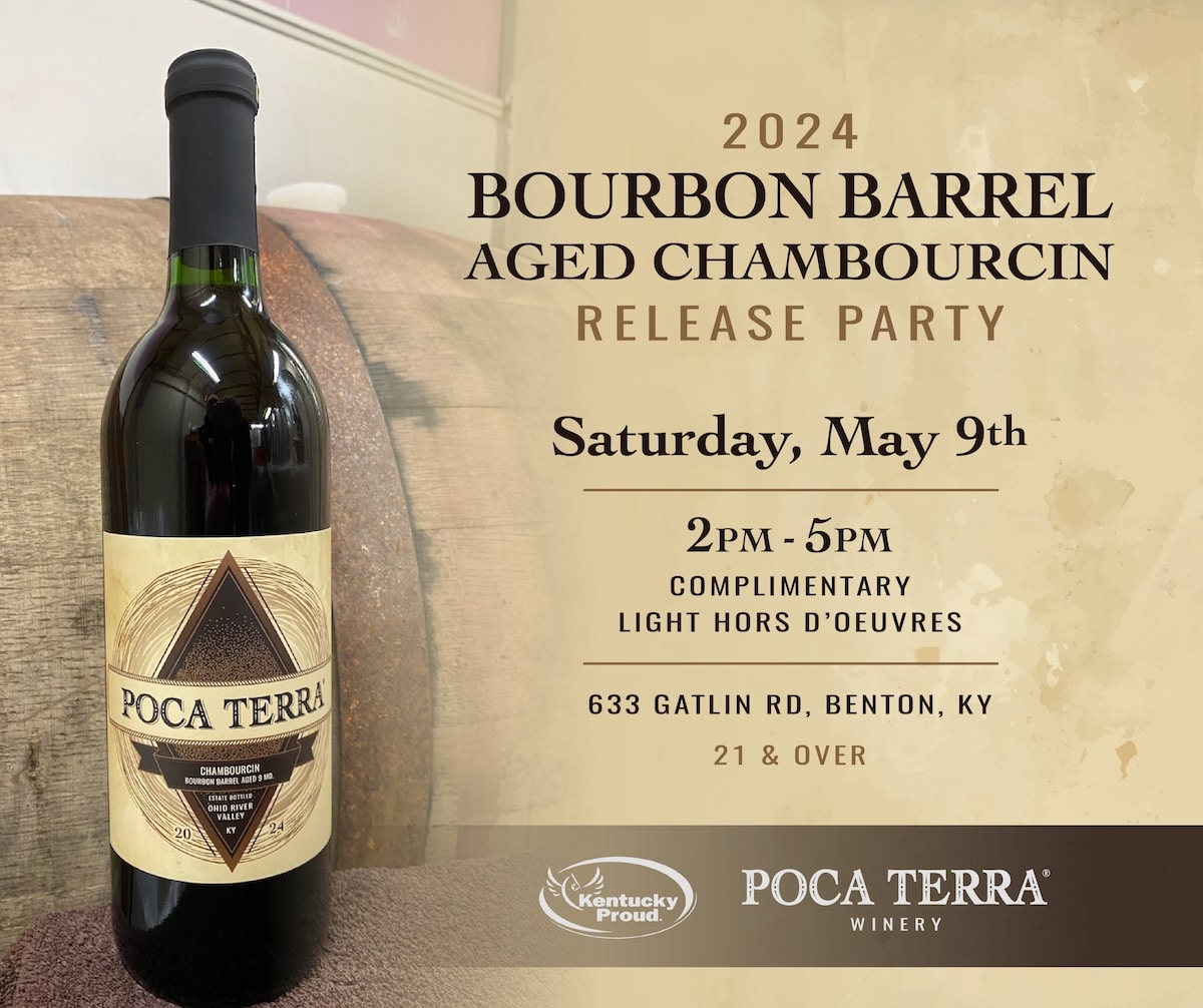 Join us on Saturday, May 9th, 2026, 2pm to 5pm as we release our 2024 Bourbon Barrel Aged Chambourcin. Grown on our own western Kentucky vines and aged for 9 months in Kentucky bourbon barrels, this medium-bodied wine is rich and bold, with notes of dark fruits, toasted oak, vanilla, caramel, and baking spices.